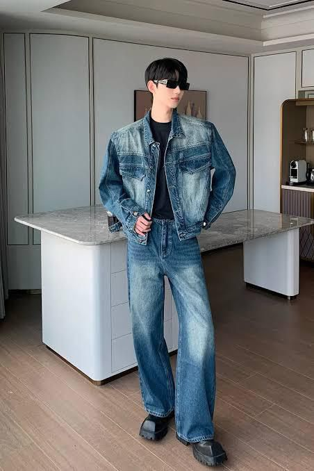 • Denim jacket with matching baggy jeans for a modern double-denim outfit