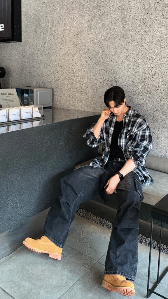 • Flannel shirt with baggy jeans for a rugged streetwear vibe