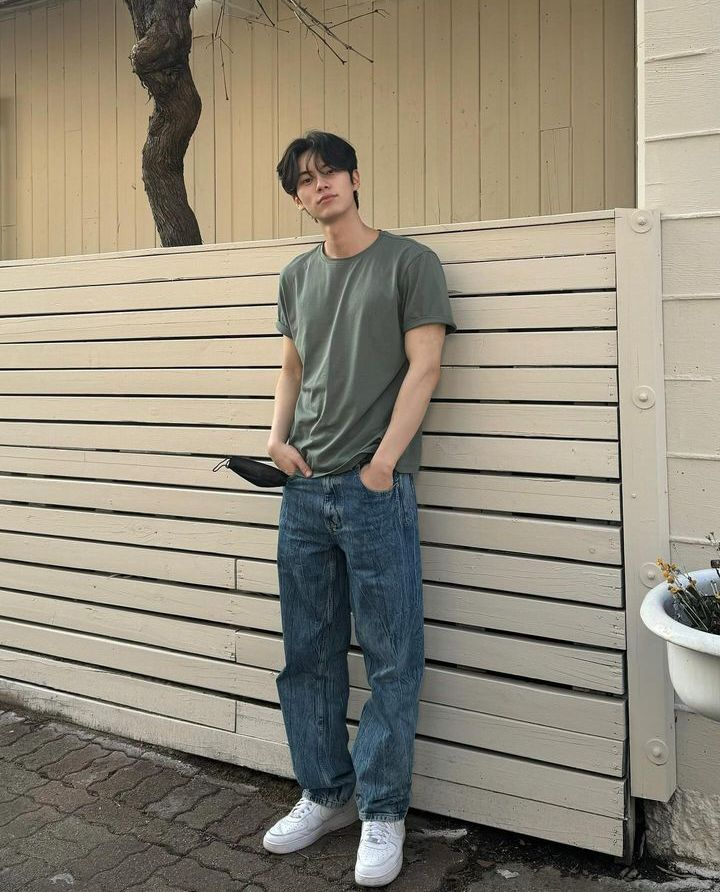 • Minimal plain tee with neutral baggy jeans for a clean aesthetic