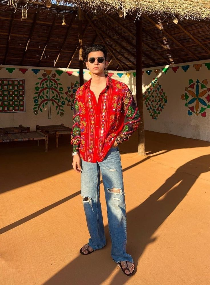 • Open shirt with inner vest and baggy jeans for a trendy layered outfit