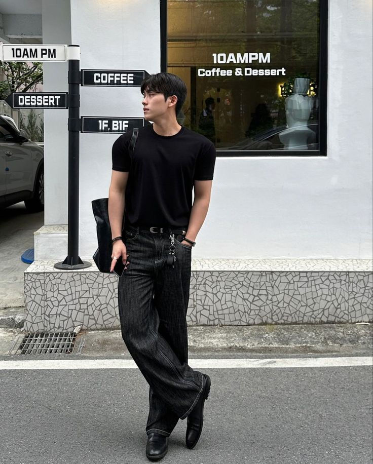 • Black fitted t-shirt with baggy jeans for a balanced silhouette
