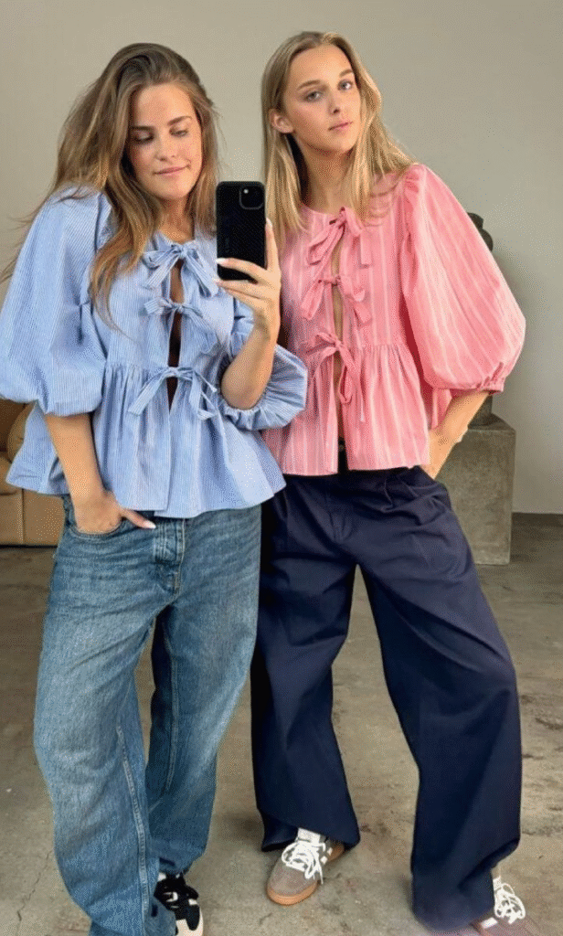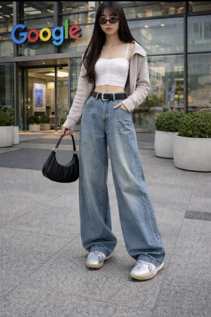 One of the most popular combinations right now is pairing baggy jeans with a fitted crop top. This contrast between loose and fitted pieces creates a flattering silhouette that looks stylish without being complicated. Light colors like white, pastel pink, or soft blue work perfectly for spring. This outfit is ideal for casual brunches where you want to look fresh and trendy.