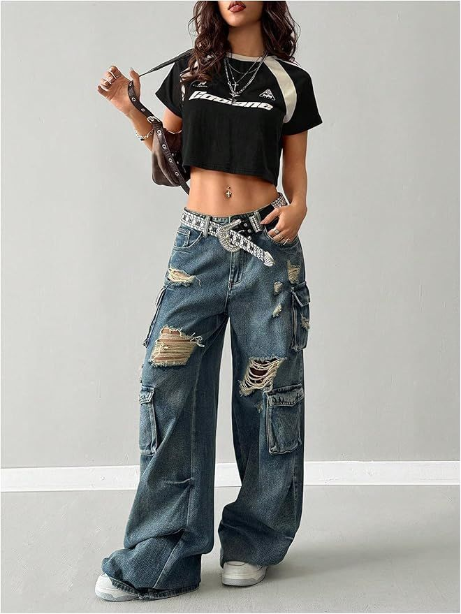 • Graphic crop tee with ripped baggy jeans for street-style vibes
