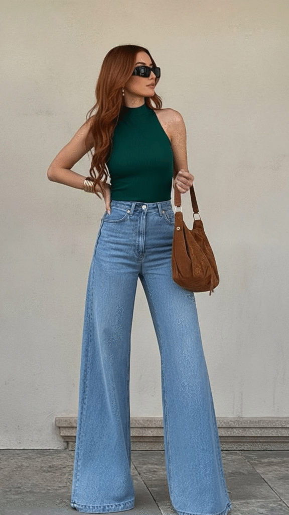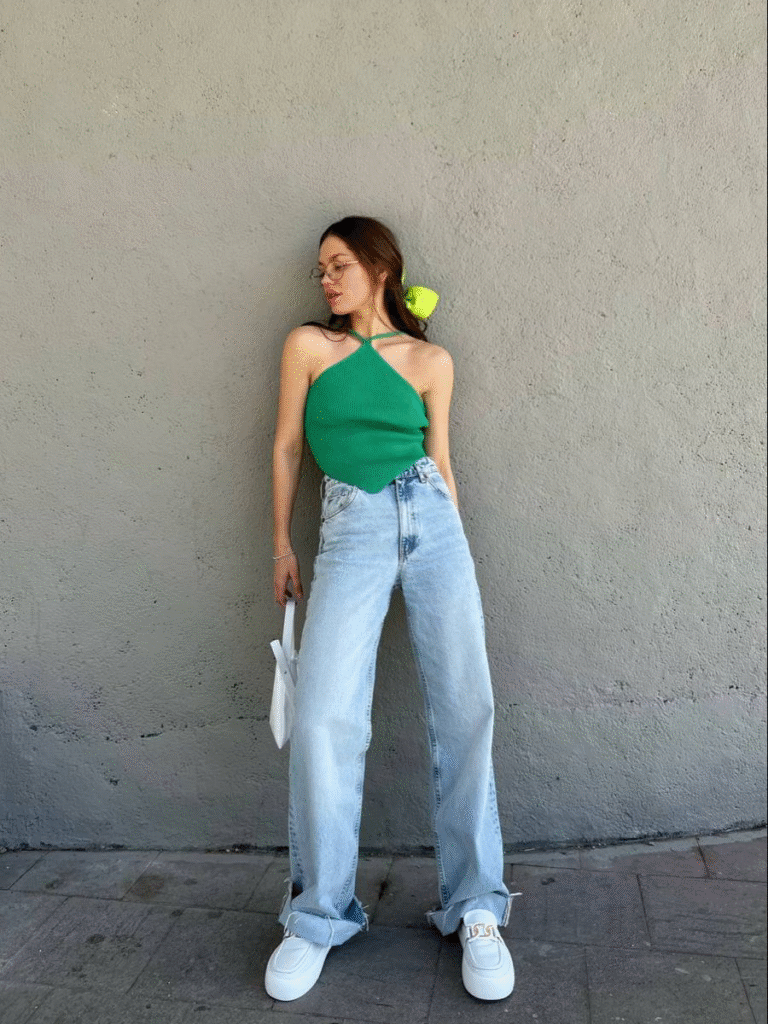 • Ribbed crop top with high-waist baggy jeans for a sleek silhouette