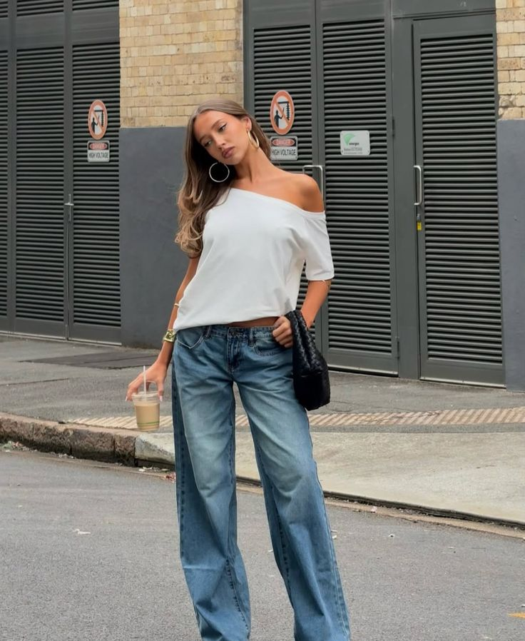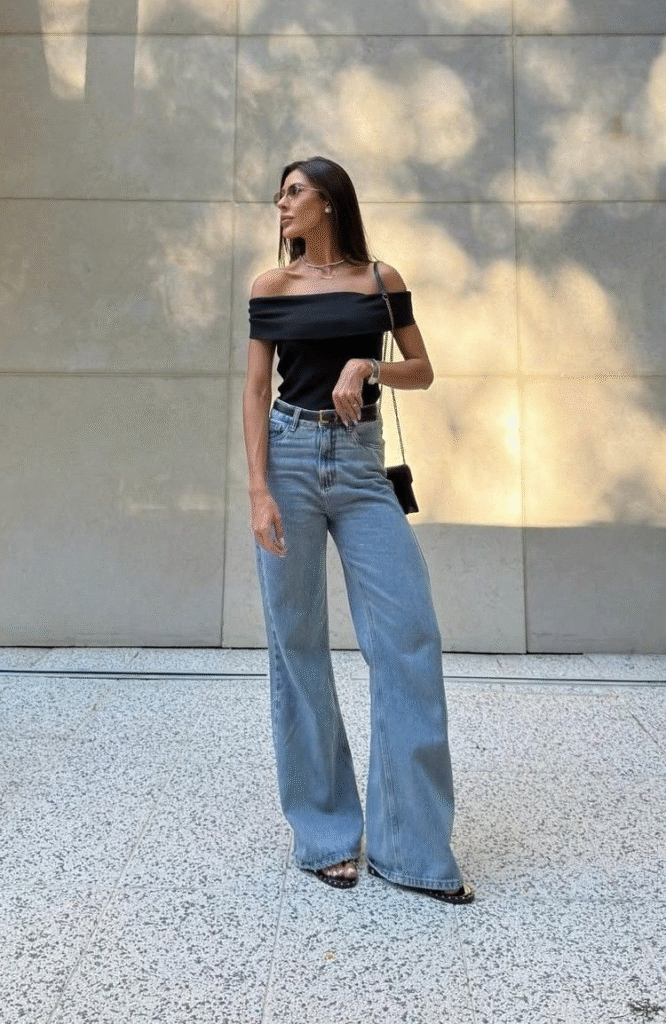 • Off-shoulder crop top with wide-leg jeans for a soft feminine touch