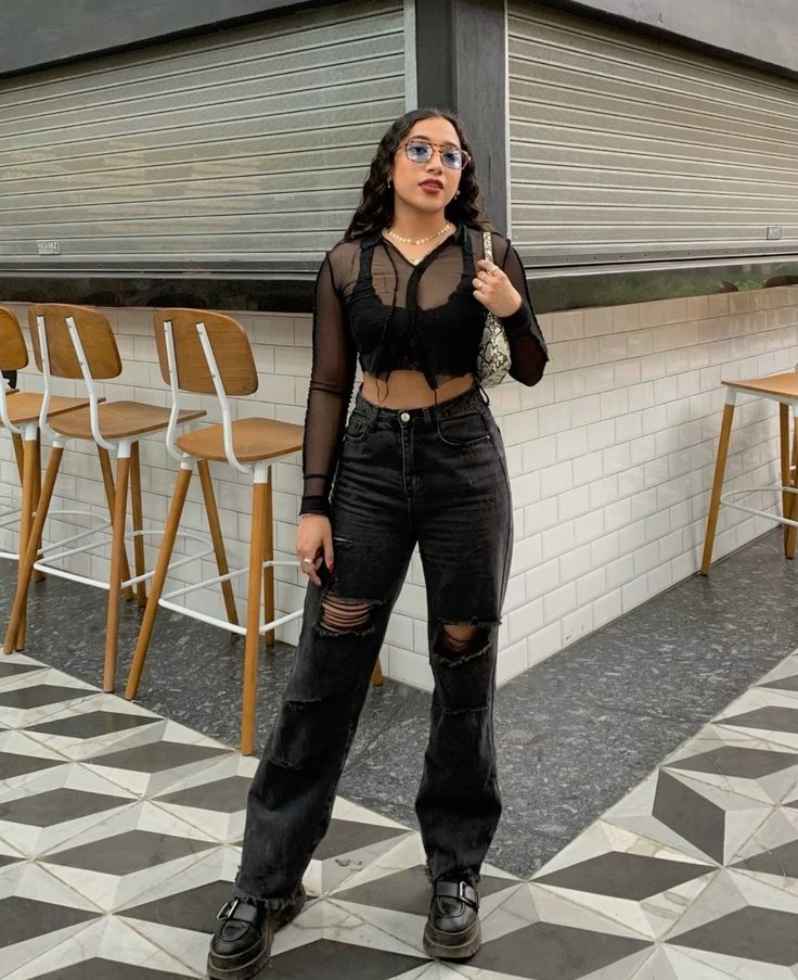• Mesh crop top layered over bralette with baggy jeans for edgy fashion