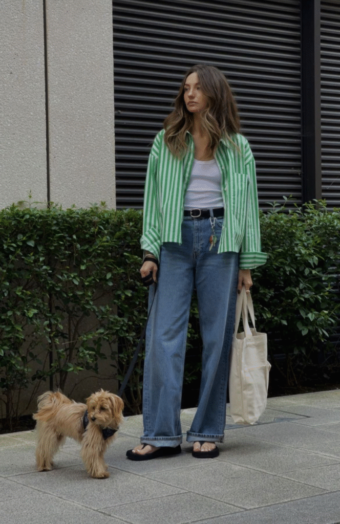 • Cropped shirt tied at waist with baggy jeans for casual chic