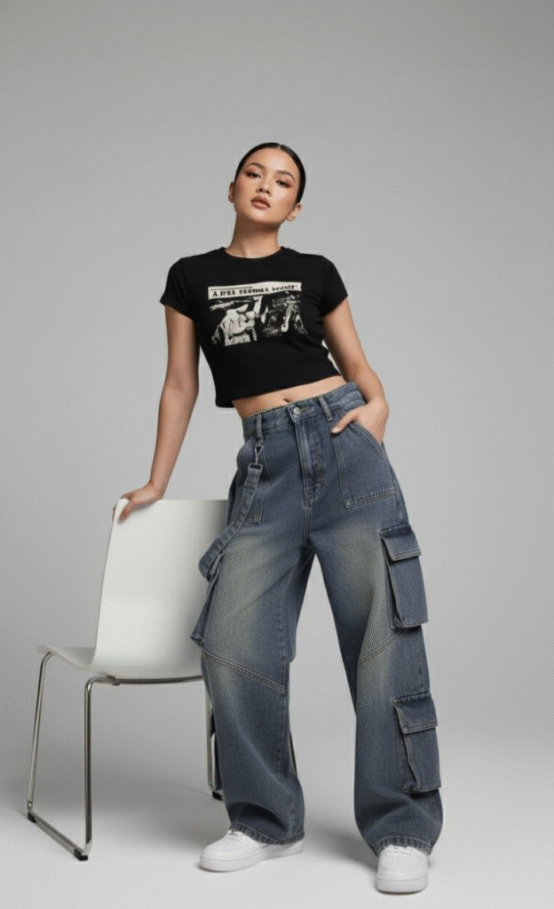 This combination isn’t just a random fashion phase. It reflects a major shift toward relaxed silhouettes and self-expression. Oversized denim is replacing skinny fits, and crop tops are evolving with new cuts, fabrics, and styles. The mix of fitted and loose creates a flattering balance for almost every body type. Another reason for its popularity is how easily customizable it is. Whether you like sporty, edgy, feminine, or minimal styles, this combo adapts to your vibe effortlessly.