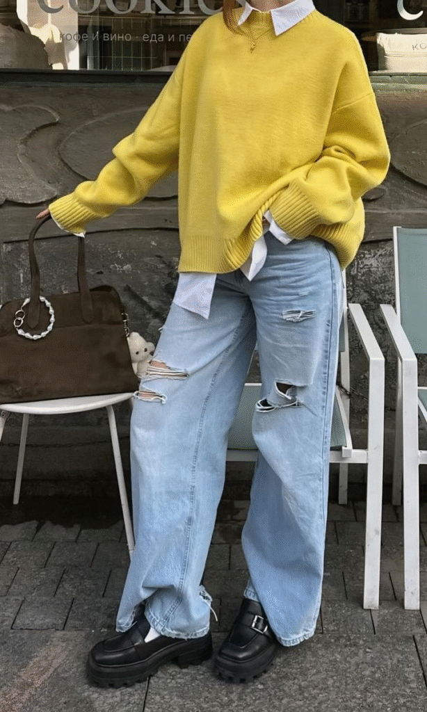 | Bottom | Baggy jeans or wide-leg pants | Adds comfort and trend appeal |