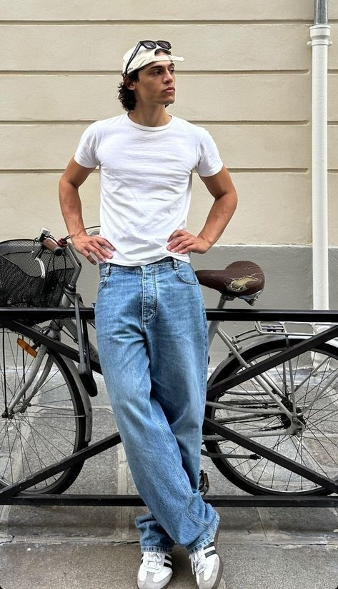 • Plain white t-shirt with blue baggy jeans and sneakers for a clean look