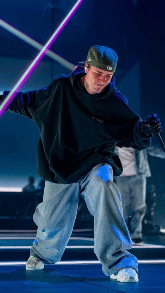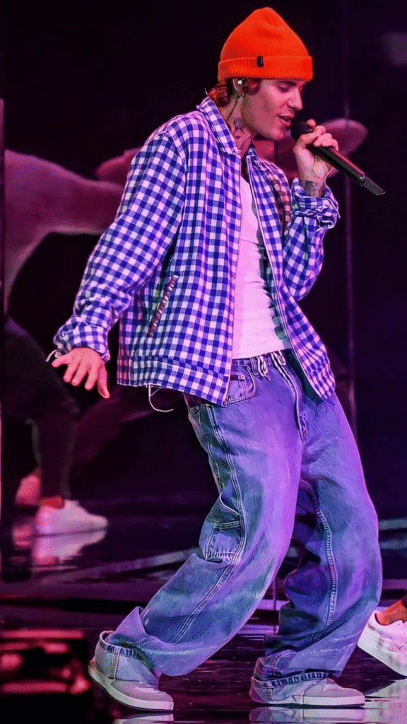 If you notice Justin Bieber’s street style, it’s often simple but very intentional. He pairs baggy jeans with oversized or basic tops in neutral colors. You can recreate this easily. Go for light or black baggy jeans with a plain oversized T-shirt or sweatshirt. Add clean sneakers, and you’ve got a minimal look that feels modern. The trick here is not overdoing anything. Let the simplicity speak.