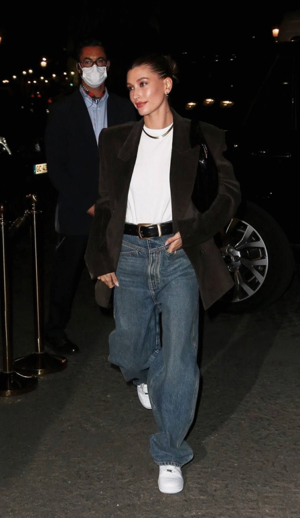 Hailey Bieber is known for her layered streetwear looks that feel polished without being complicated. She often combines baggy jeans with crop tops, blazers, or oversized jackets. This layering adds structure and depth to the outfit. To recreate this, start with baggy jeans and a simple top, then add a jacket or shirt layer. Keep the colors balanced so the outfit doesn’t feel chaotic.