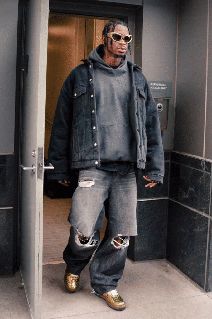 If you prefer a stronger, more expressive style, Travis Scott’s outfits are a great reference. He mixes baggy jeans with graphic tees, statement sneakers, and bold accessories. His outfits feel energetic and slightly rebellious. You can try this by adding one standout piece like a graphic T-shirt or unique sneakers while keeping the rest of the outfit simple.