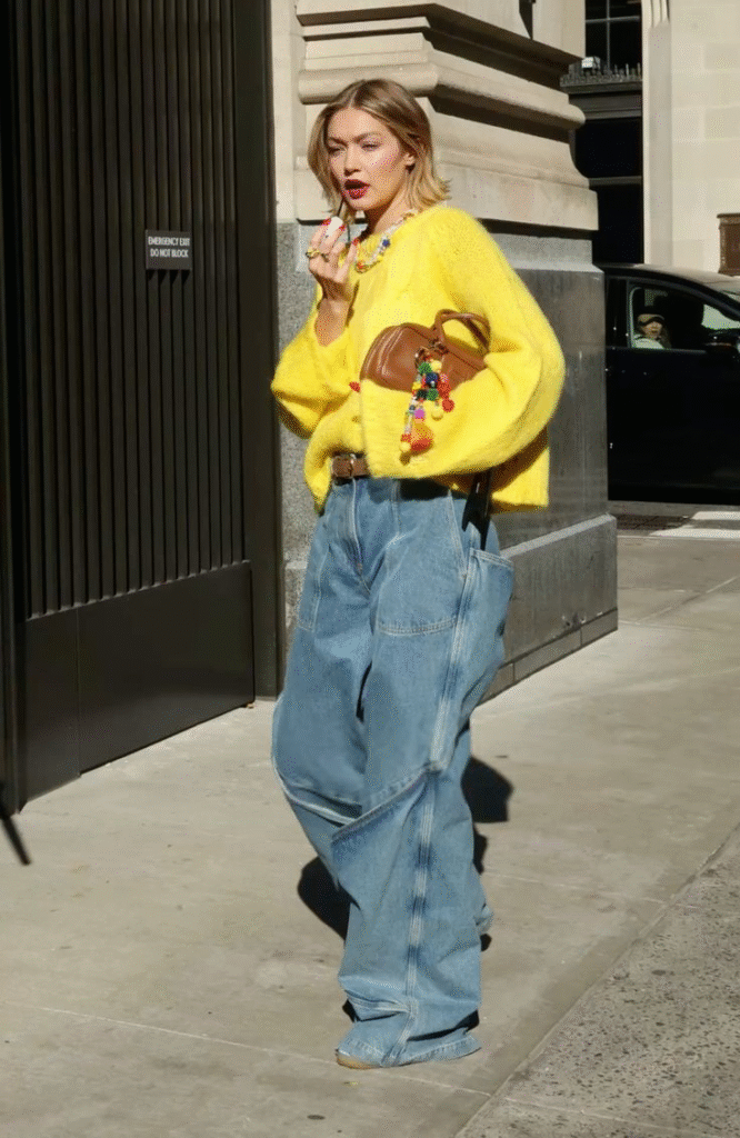 For evening or night outings, Gigi Hadid often leans toward slightly edgier combinations. Think darker baggy jeans with fitted tops, leather jackets, or boots. This adds a bold touch without losing the relaxed vibe. It’s a great way to make baggy jeans work beyond casual settings.