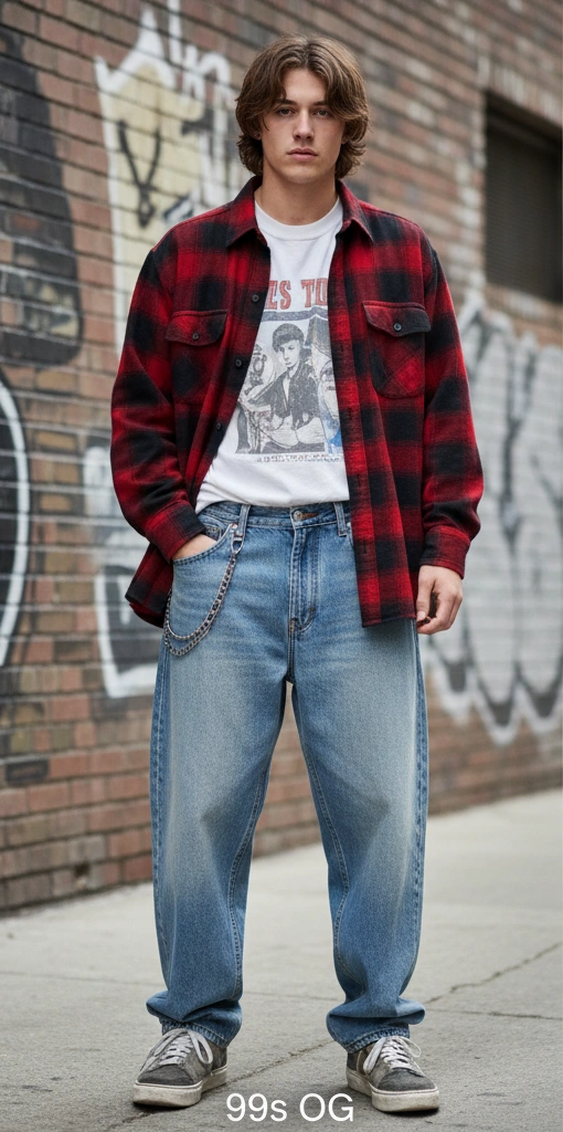 - Signature Styling (90s): Paired with oversized graphic tees, flannel shirts, chunky skate shoes (Vans, Etnies), combat boots (Doc Martens), or layered hoodies. Think grunge, hip-hop, and skate culture.